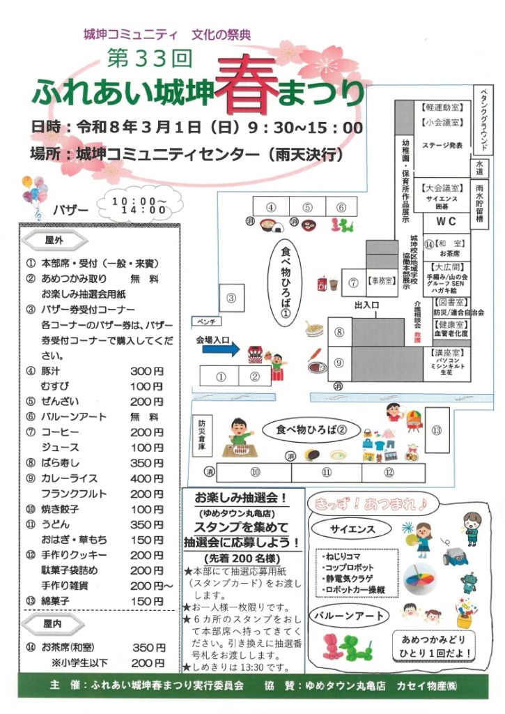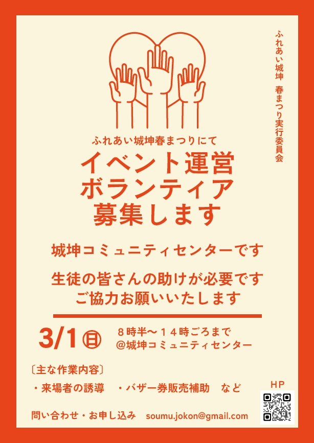 令和7年度 第33回ふれあい城坤春まつり開催について 問い合わせ・お申し込み先メールアドレス soumu.jokon@gmail.com (興味のある方、お気軽にメールくださいね) Googleフォームからも申し込みできます! ▼▼▼ こちらをクリック